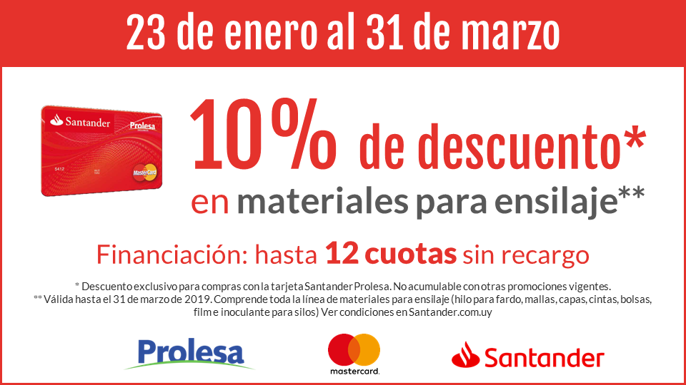 **Promoción válida hasta el 31 de marzo de 2019. Comprende toda la línea de material para ensilaje (hilo, film, mallas y alambre para fardos; capas, cintas, bolsas e inoculantes para silos; y medidores de humedad). Ver bases y condiciones en santander.com.uy