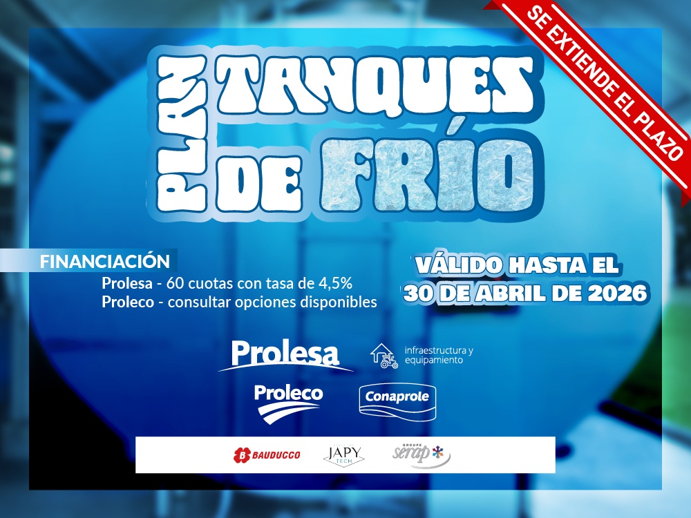 Se extiende el Plan Tanques de Frío hasta el 30 de abril 2026. El mismo ofrece una amplia variedad en marcas y modelos para que elija el tanque más adecuado a sus necesidades. La oferta incluye tanques abiertos con lavado manual desde 1.100 a 4.200 litros y tanques cerrados con lavado automático desde 3.070 a 30.000 litros de capacidad.